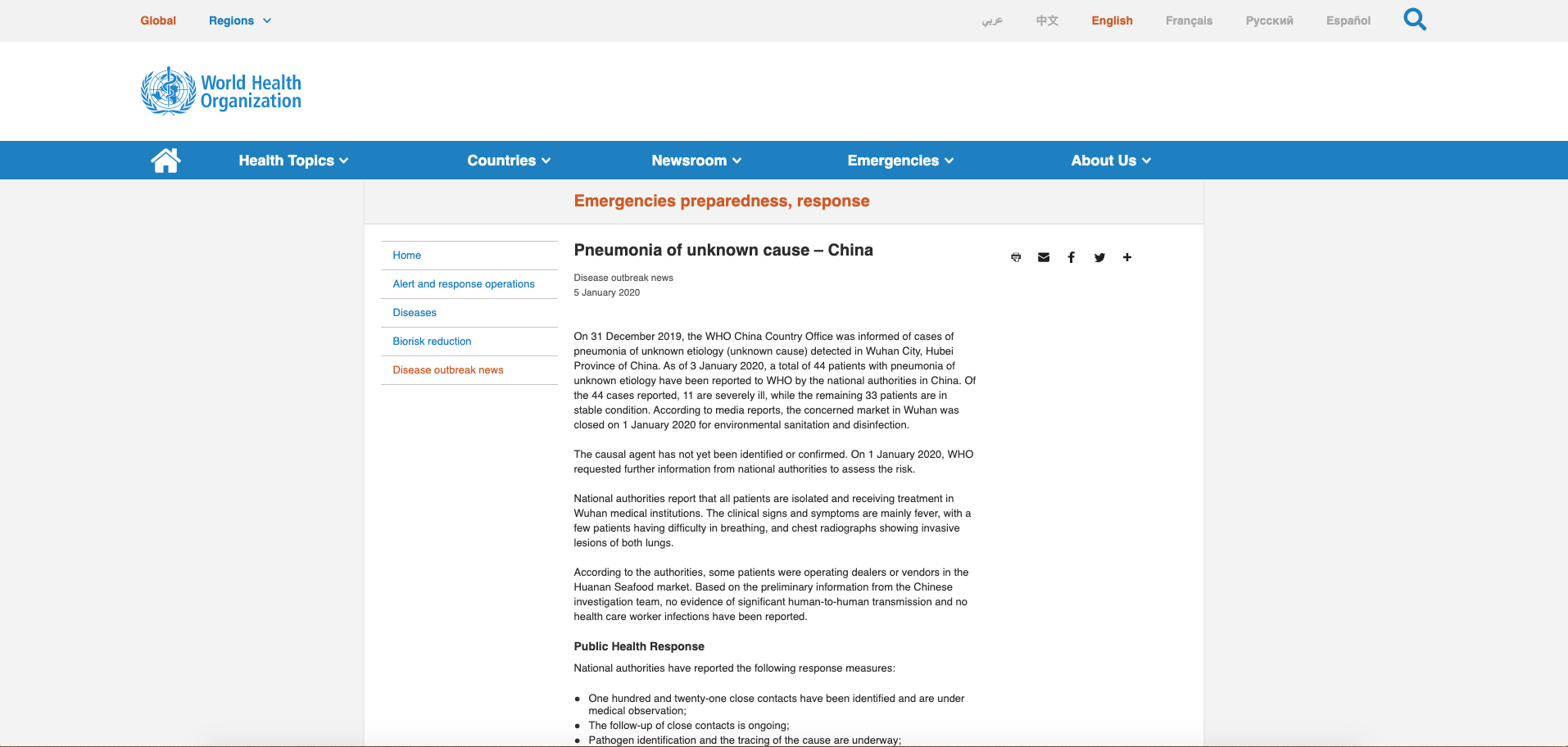 The World Health Organization (WHO) is not yet recommending any specific measures or travel restrictions. The organisation added: “The symptoms reported among the patients are common to several respiratory diseases, and pneumonia is common in the winter season; however, the occurrence of [at their time of writing] 44 cases of pneumonia requiring hospitalisation clustered in space and time should be handled prudently.”