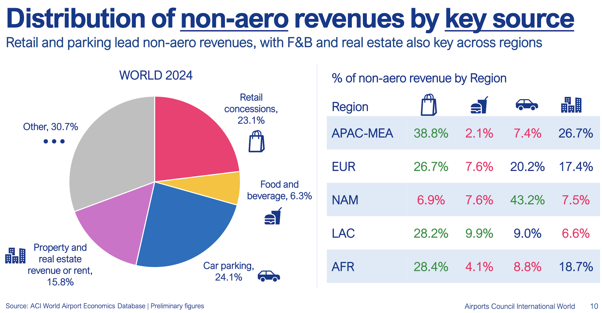 Car parking at 24.1% and retail at 23.1% lead non-aeronautical revenues by channel, with food & beverage at 6.3%. Retail commands the highest share of non-aero incomes in Asia Pacific-Middle East at 38.8%, with F&B representing just 2.1%. In Europe, retail and F&B represent 26.7% and 7.6% respectively. In North America, car parking at over 40% dwarfs the proportion in any other region.