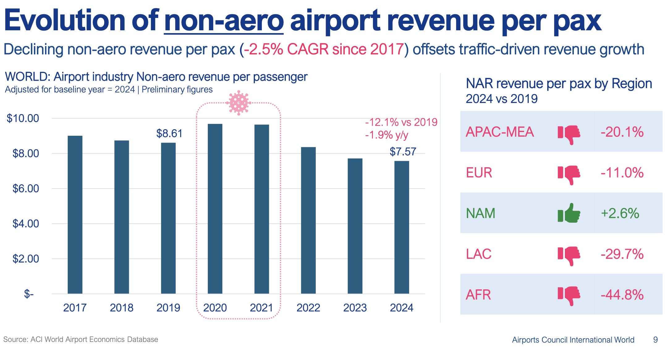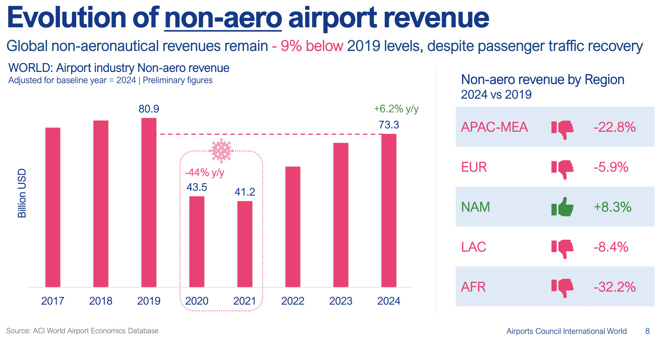 He noted that while non-aeronautical revenues climbed by +6.2% year-on-year in 2024 to US$73.3 billion, they were sharply down compared to 2019 as noted above. This decline played out in most regions – APAC-MEA was behind by -22.8% for example – with the exception of North America, which saw +8.3% growth.