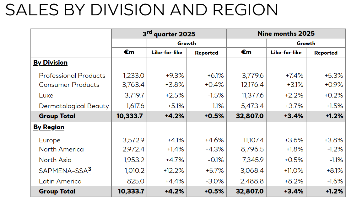 Groupwide, L’Oréal posted continued acceleration in like-for-like sales growth across all divisions and regions for the nine months.