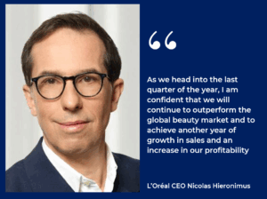 L’Oréal CEO Nicolas Hieronimus said, “As anticipated, our like-for-like growth continued to sequentially accelerate, reaching +4.9% in the third quarter.