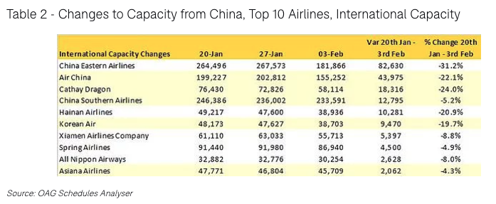In all, 24 airlines have stopped all scheduled services to China. These accounted for nearly 48,000 seats per week or around 2% of international capacity, reported OAG.