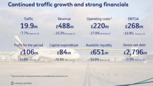 Net income per passenger increased by a healthy +16.1% to £5.52 (US$7.23). Total airport revenue was up +15.3% to £487.9 million (US$639 million). EBITDA climbed +13.9% to £268 million (US$351 million) while net profit surged +33.8% to £106 million (US$138.8 million).