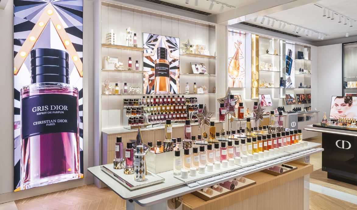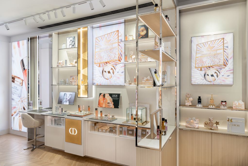 The design reflects Dior’s savoir-faire, through a warm, well-lit environment that highlights the fragrances and beauty assortment. High-quality materials such as marble, fabrics and gilded metal reinforce the brand’s luxury positioning.