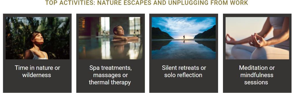 To disconnect from technology, restore balance and recharge, wellness travellers are building itineraries around nature and wilderness experiences (49%), silent retreats or solo reflection (37%), spa treatments, massages or thermal therapies (36%), and meditation or mindfulness sessions (33%).