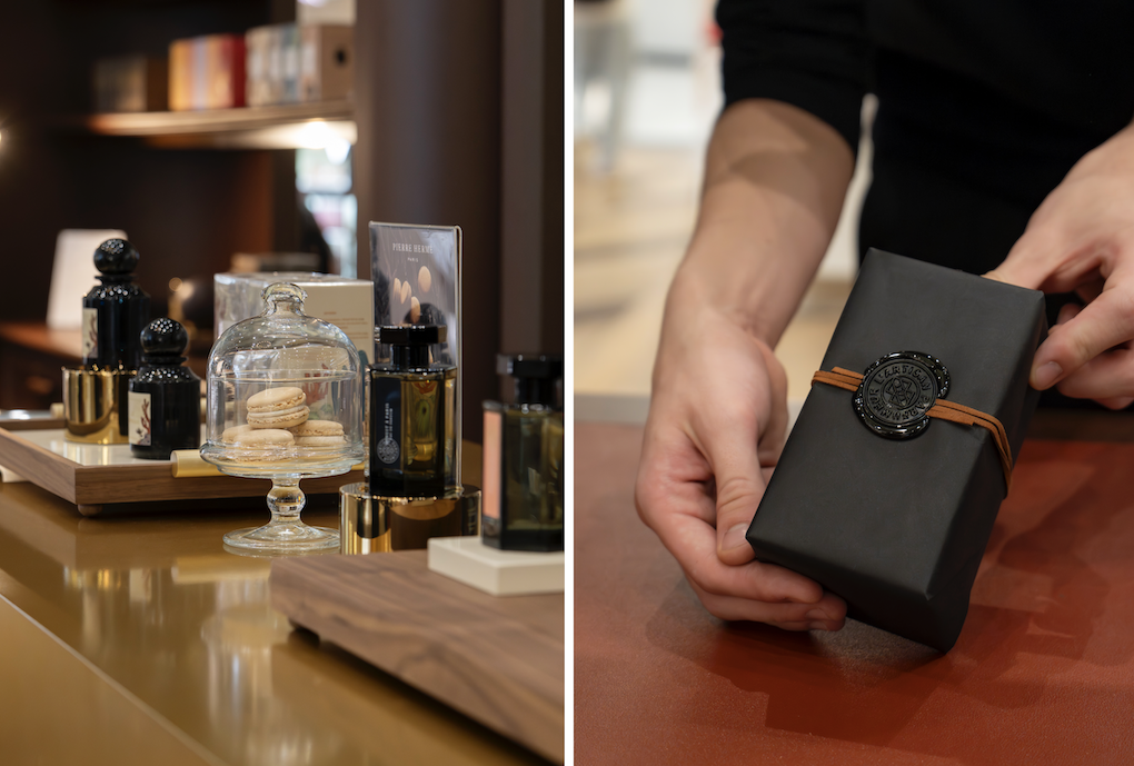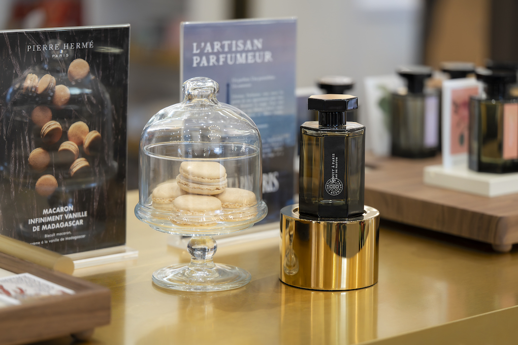 Notably, the pop-up merges the worlds of French perfumery and gastronomy by offering complimentary macarons by Parisian patisserie Pierre Hermé and chocolates from Valrhona.