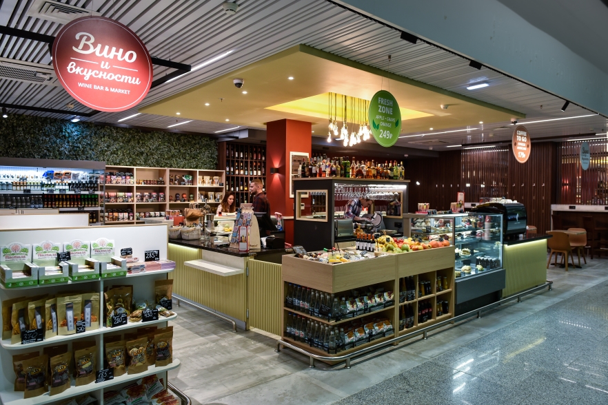 The Vino & Vkusnosti organic foods and products market (pictured below) is located on the first floor in the arrivals hall. It offers healthy produce such as fresh and dried fruit, vegetables, granola, yoghurts, herbs, honey, jam, nuts, cheese, and other farm products from the Leningrad region.