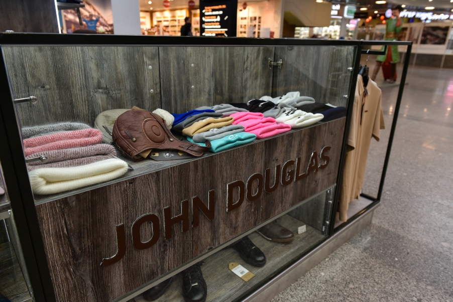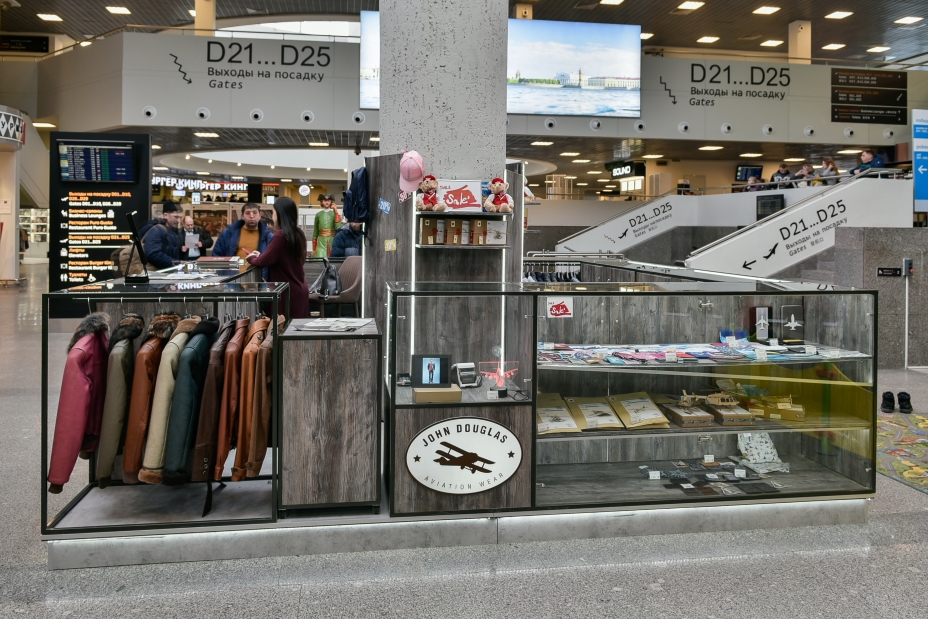 The John Douglas aviation fashion and accessories pop-up store (pictured below) is also located in the domestic departures hall. It offers leather flight jackets, aviation-themed t-shirts, caps and hats, scarves, ties, belts, wallets, purses, and souvenirs, as well as airplane models. The store is located by gate D21.