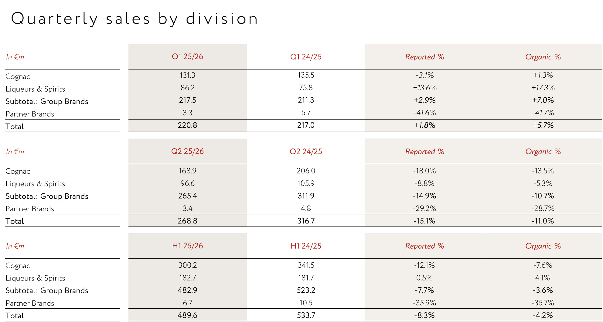 By key category, Cognac sales fell -12.1% year-on-year in the half with Liqueurs & Spirits up slightly (+0.5%).
