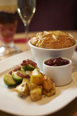Main dishes include Norfolk turkey, braised leek and chestnut pie with honey roasted nips, buttered sprouts & bacon and cranberry & orange compote, priced at £15.95 (US$25).
