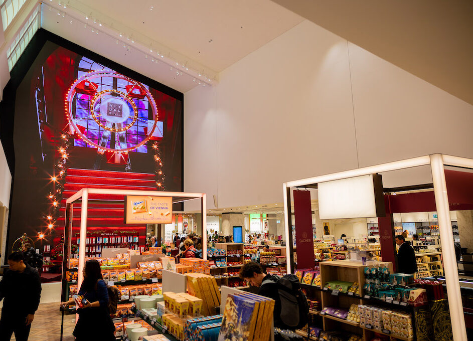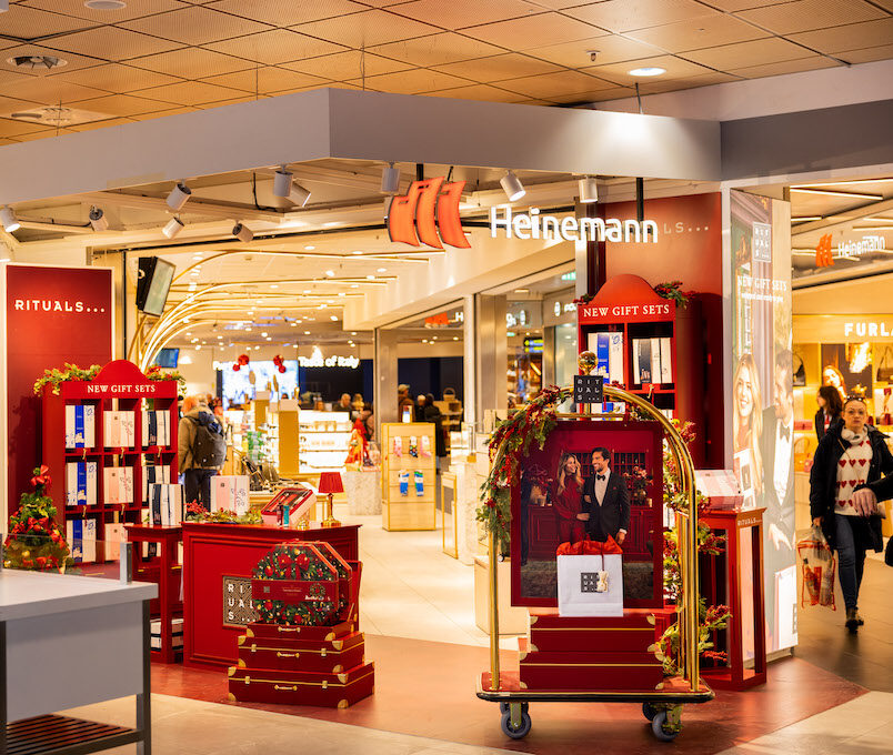 Vienna Airport houses a flagship activation in partnership with Gebr. Heinemann which combines bold visual impact with digital storytelling elements. In a first for Rituals, the airport features an immersive 3D screen at the main duty-free shop, drawing attention to a stand-out holiday activation below.