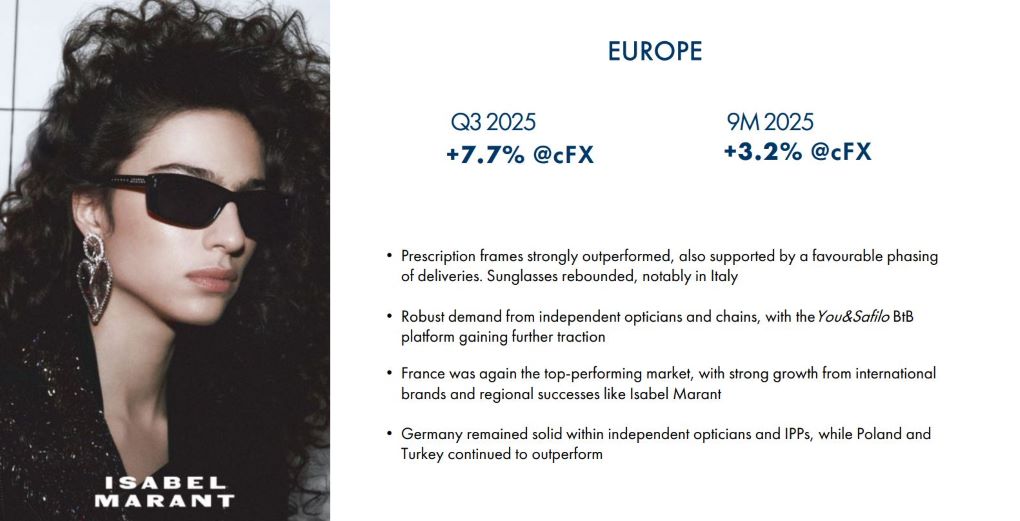 Prescription frames continued to expand across all regions, with sunglasses driving recovery in Europe amid stronger sell-through.