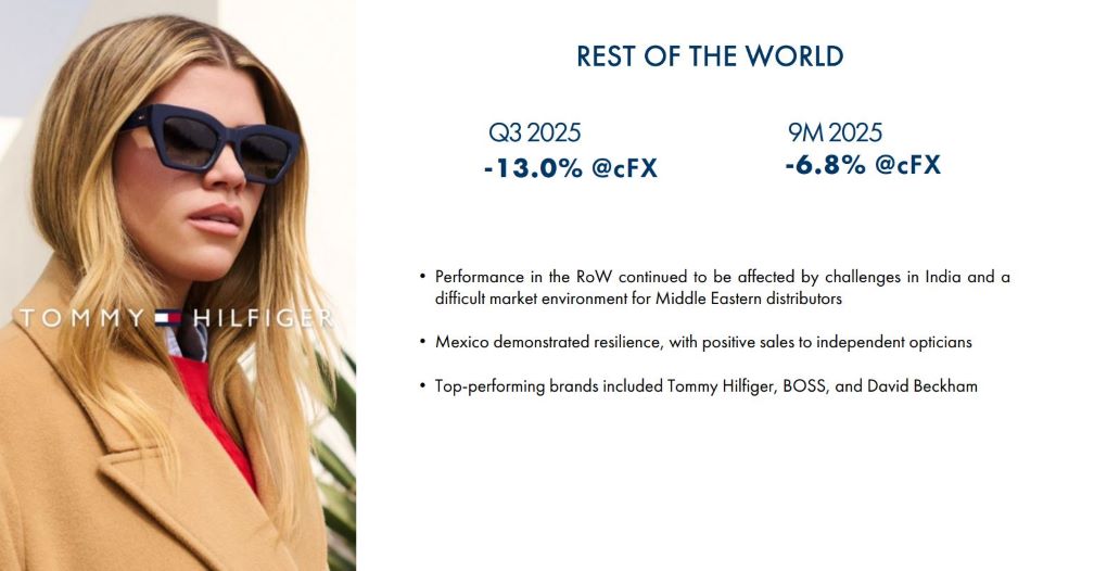 In the eyewear category, wholesale revenue grew at a mid-single-digit rate, supported by solid demand from chains and independent opticians, with key brands including Tommy Hilfiger, Marc Jacobs, BOSS, Kate Spade and David Beckham driving the momentum.