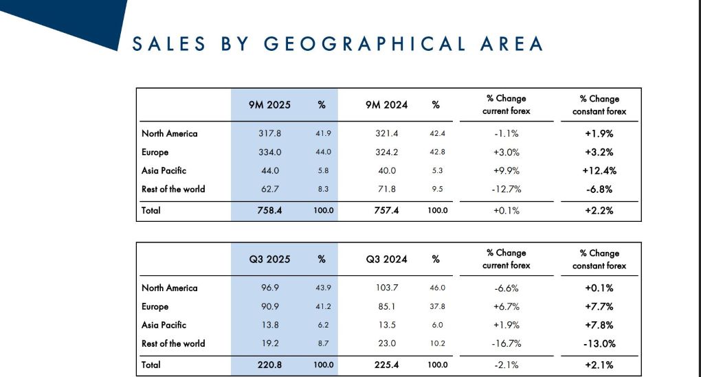 Sales in the Rest of the World softened, with Q3 revenue declining to €19.2 million, down -13% at constant exchange rates (-16.7% at current rates), due to ongoing challenges in India and a difficult market environment for Middle Eastern distributors.