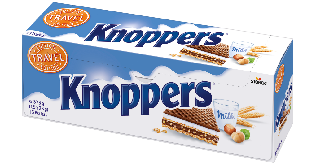 Knoppers features a layered wafer with chocolate-nut spread, crunchy hazelnut pieces and creamy milk filling. The travel edition offers 15 individually wrapped wafers for on-the-go snacking.