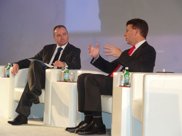 Paul Griffiths (above and pictured below in conversation on stage with The Moodie Report’s Dermot Davitt) delivered an excellent, thought-provoking presentation on the industry’s future |