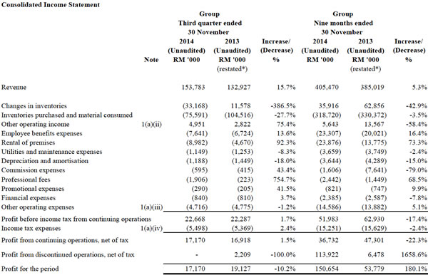 Profits before income tax from continuing operations were up +1.7% to RM22.7 million (US$7 million), with most of the revenue growth offset by increases in rental and professional fees.