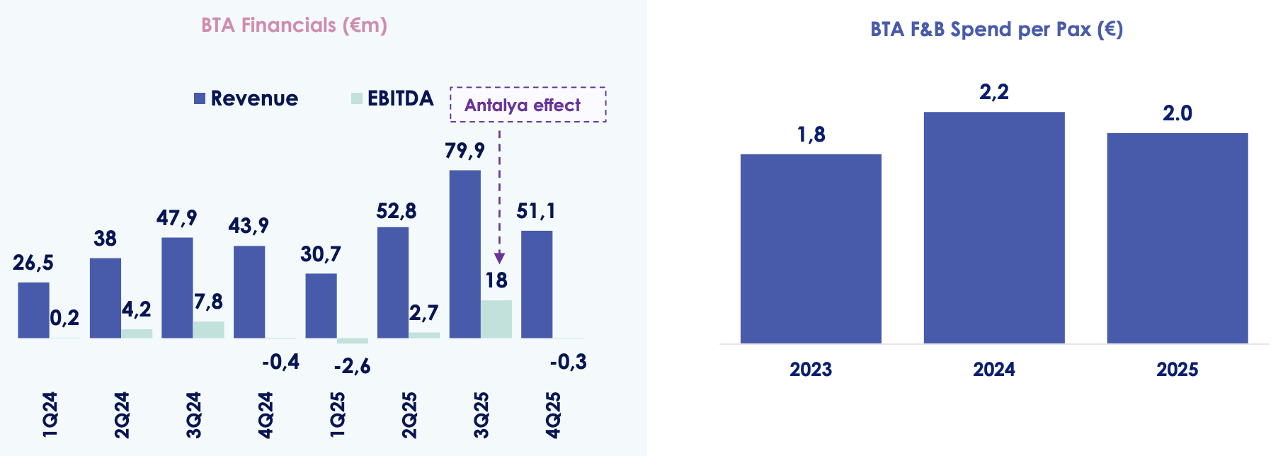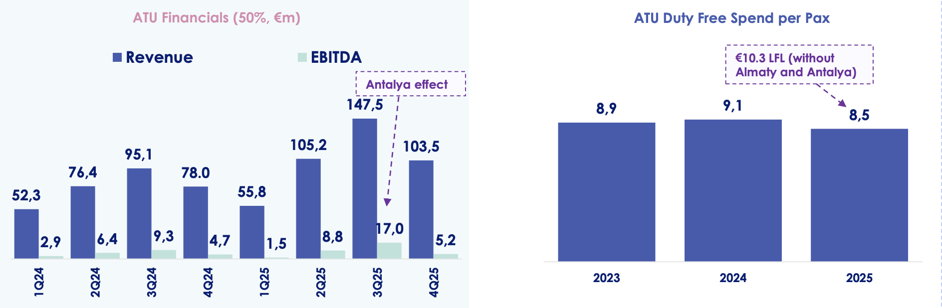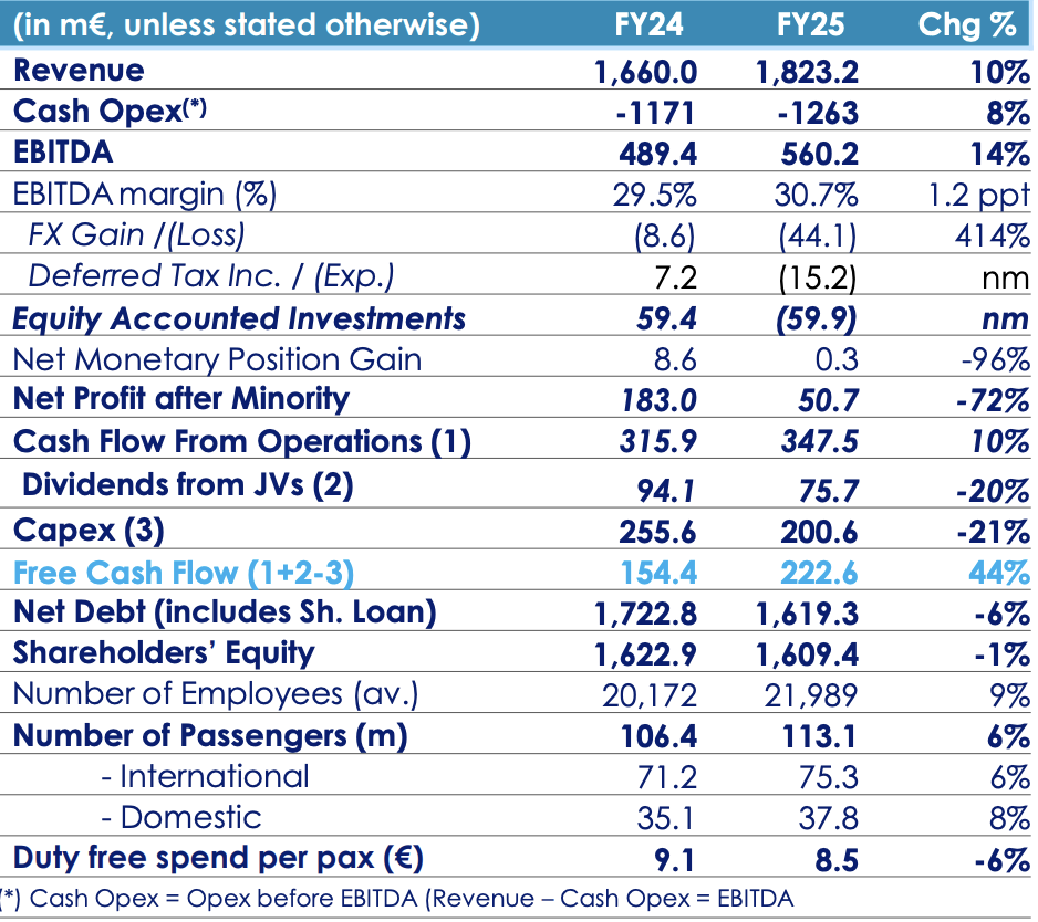 Duty free spend per passenger (SPP) dipped by -6% to €8.50, the figure diluted by the addition of Almaty and Antalya airports, which were both still in ramp-up phases. Like-for-like SPP (without Almaty and Antalya) in FY25 was €10.3- (+14% year-on-year).