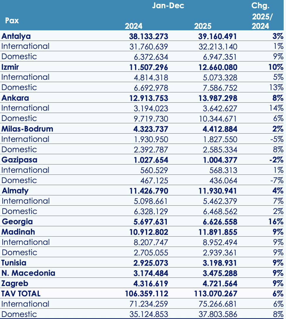 TAV Airports served 113 million passengers in the year, up +6% on 2024. This included 75 million international travellers, up +6%, and 38 million domestic, up +8% year-on-year across the network.