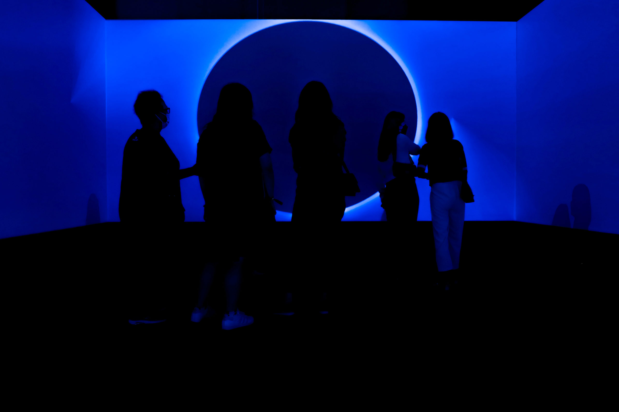 Sense of Blue was debuted at the 2021 edition of art fair Art Basel in Basel, Switzerland. The immersive installation gradually immerses audiences into darkness using motion sensors, video projections and hidden digital algorithms. The installation marries a mysterious minimal aesthetic with technical sophistication that enables viewers to use movement to shape their environment through shifting light facets.