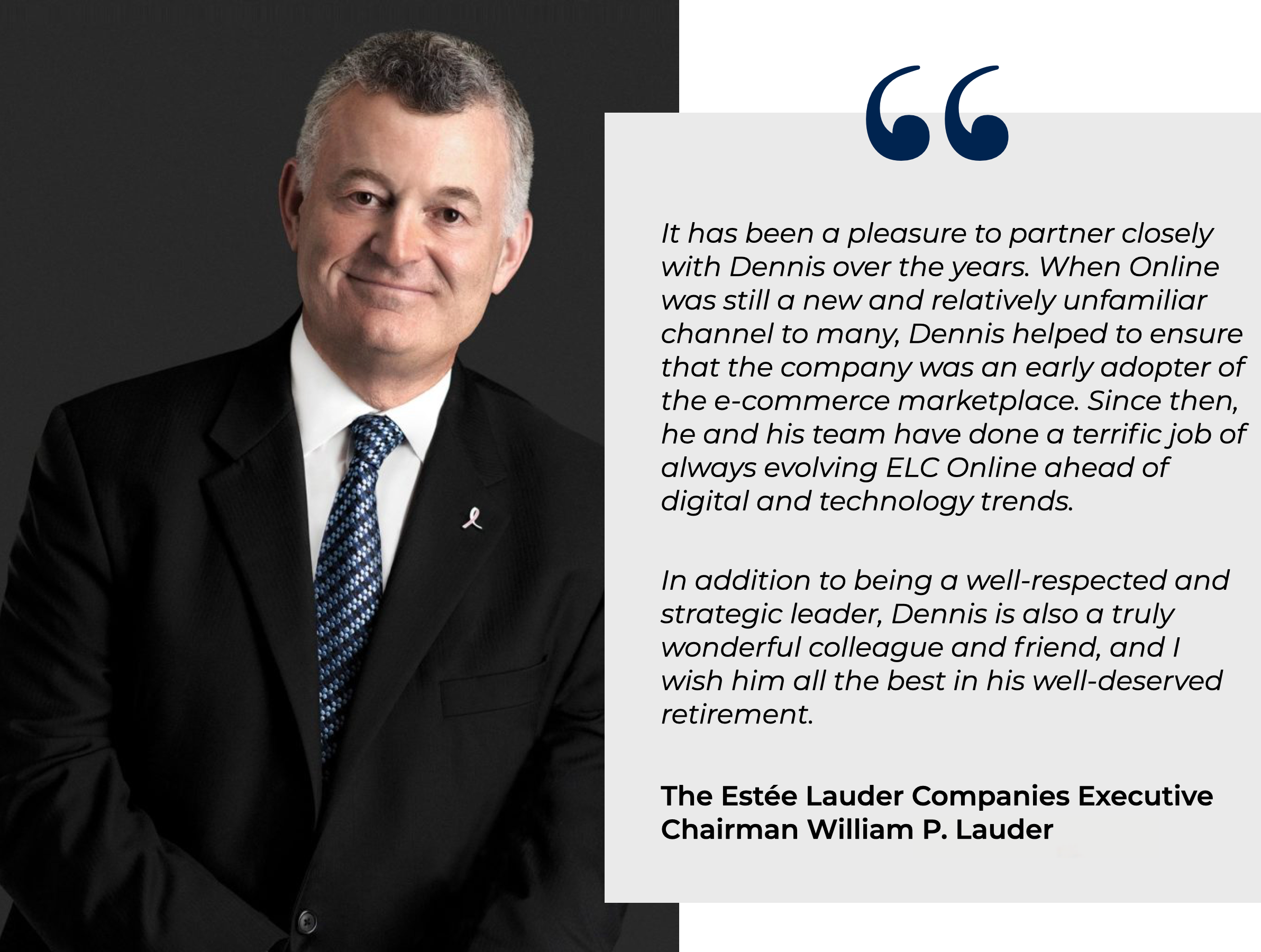 The Estée Lauder Companies Executive Chairman William P. Lauder said, “It has been a pleasure to partner closely with Dennis over the years. When Online was still a new and relatively unfamiliar channel to many, Dennis helped to ensure that the company was an early adopter of the ecommerce marketplace. Since then, he and his team have done a terrific job of always evolving ELC Online ahead of digital and technology trends. In addition to being a well-respected and strategic leader, Dennis is also a truly wonderful colleague and friend, and I wish him all the best in his well-deserved retirement.”