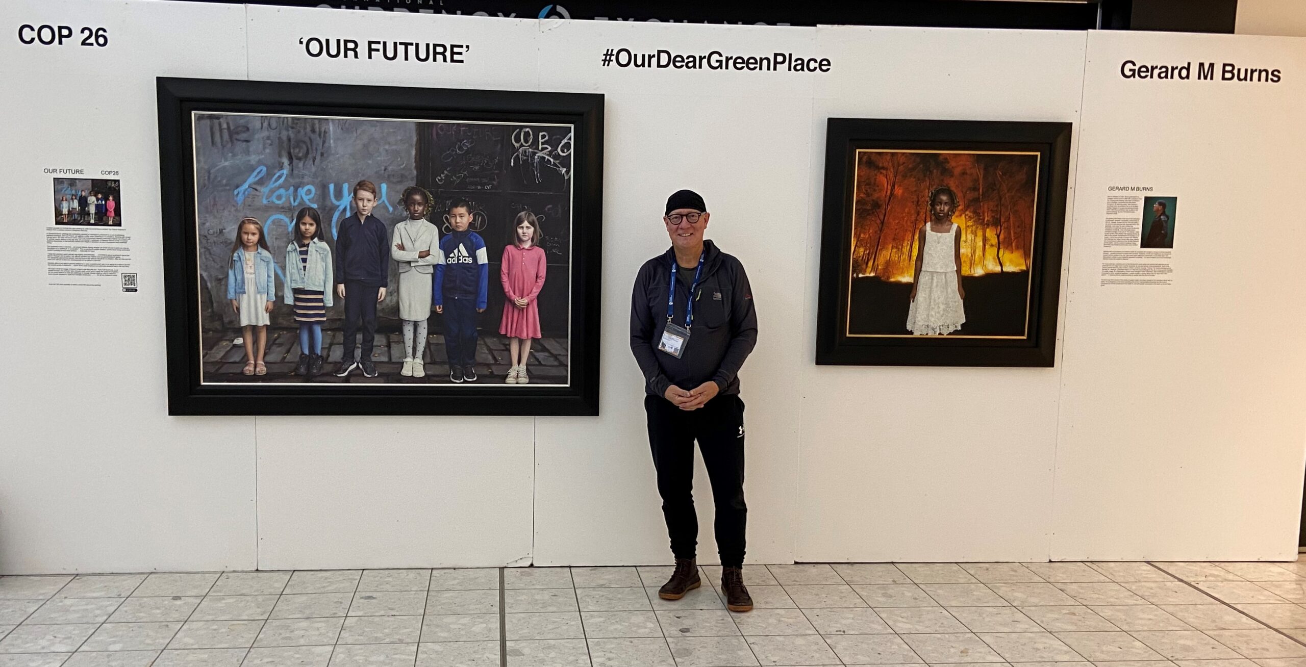Renowned Scottish artist Gerard M. Burns is displaying two pieces of work at the airport, created especially for COP26. A powerful painting entitled Our Future features six children from a primary school in Glasgow’s East End and hangs next to a second piece of work entitled All Our Fears.