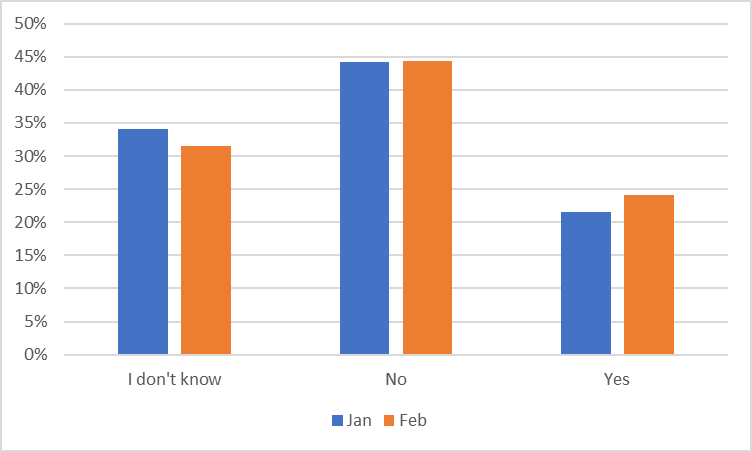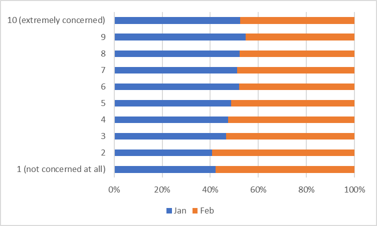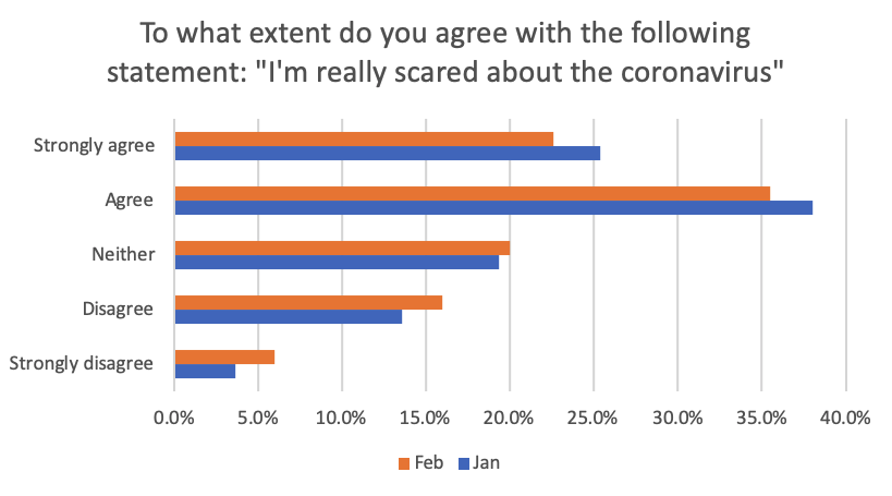 Interestingly, respondents who said they feared COVID-19 declined visibly in February compared to January. The February survey was conducted between 11 and 21 February and respondents may have reacted positively to news that the spread of the virus in China was slowing and there were no strong outbreaks outside of the Mainland. On 16 February, the Head of Leishenshan Hospital, the facility in Wuhan built in remarkable quickfire fashion to treat COVID-19 patients, stated “The real inflection point [of the COVID-19 outbreak] has come. Over the past five days, the number of fever cases has dropped. It is like a downward slope. It’s not coming back, I’m confident.”