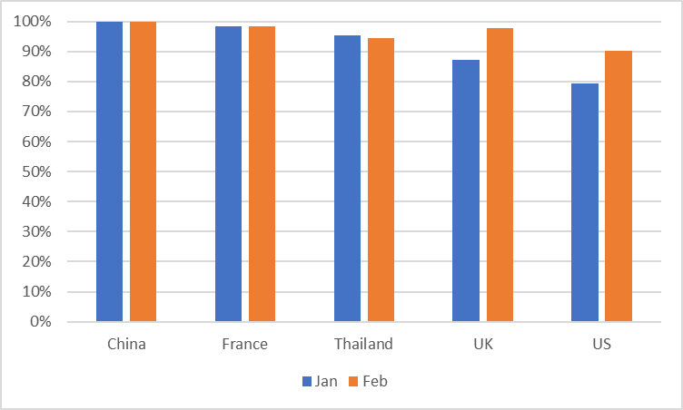 Awareness of COVID-19, measured by tallying those who replied they were well informed and those who had seen it in the news, is high for China, France and Thailand. Awareness in the UK and US increases in February as global media companies ramp up their coverage.