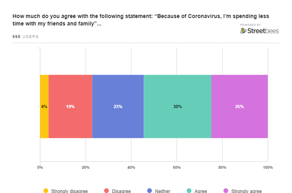 Fear of contagion is decreasing human to human contact but increasing time spent online. Respondents reply that fear of the virus and being forced in isolation is resulting in less time spent with family & friends.