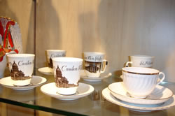 | Upstairs in the gallery of specialist shops Korean travellers admire a quality destination merchandise offer in Russian House, typified by this beautiful Lomonosov hand-painted porcelain coffee set | |