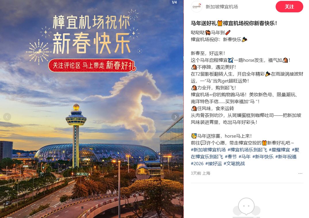 Changi Airport Group has unveiled a visually striking Year of the Horse campaign on social media, featuring a cloud-formed galloping horse illustration, wishing travellers a joyful Lunar New Year and inviting them to start their journey at Singapore Changi Airport.