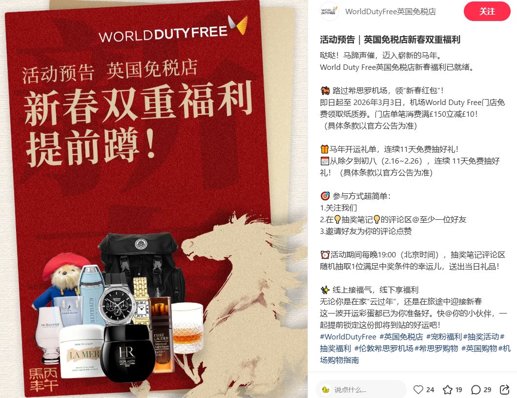 At Heathrow Airport, travellers can collect a New Year red packet voucher offering £10 off £150 spend (until 3 March), while an 11-day online prize draw campaign from Lunar New Year’s Eve encourages digital engagement and in-store sales during the festive period.