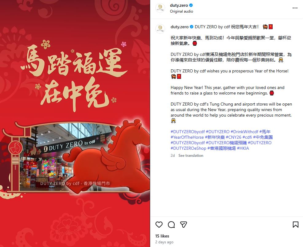 Through an Instagram video, Duty Zero by cdf showcased animated horse displays and festive staff greetings, bringing Lunar New Year cheer.