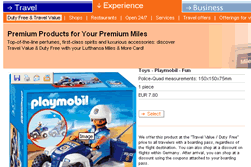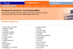 Left-hand links divide the available products into seven categories: perfumes (which includes cosmetics as well as fragrances); sweets, coffee, tea; tobacco; spirits; wine; accessories; toys. And there are links, too, to information about the Miles & More award card, the month’s special offers, plus new products, of which there are currently six, all perfumes.