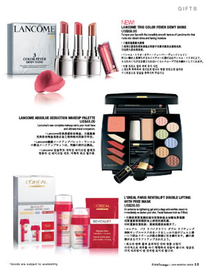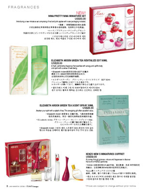 Passengers will be spoilt for choice with ten pages of perfumes to choose from under the Fragrances category. Well-known perfume brands such as Bvlgari, Calvin Klein, Hugo Boss, Dolce & Gabbana, Ralph Lauren, Giorgio Armani, Davidoff, Kenzo and Burberry are offered. Various miniature sets, twin packs and coffrets are available as well.