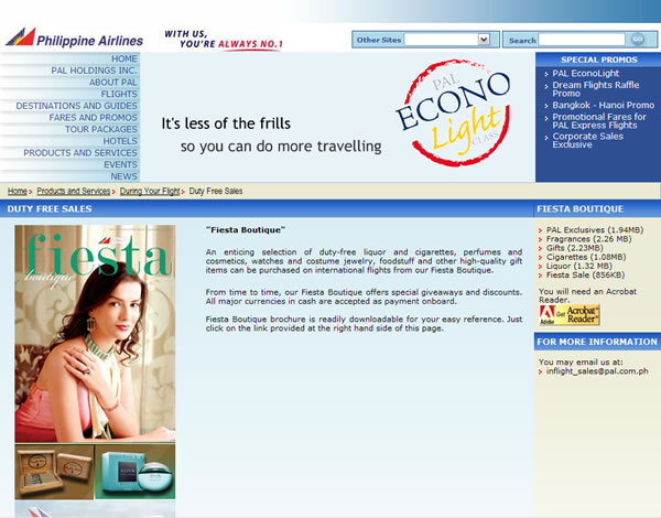 Besides the navigation panel, the airline’s duty free sales service, Fiesta Boutique Inflight Duty Free Shop, is featured prominently on the main site’s homepage via a banner link for easy access as well as to generate interest.
