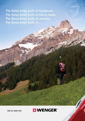 A new advertising campaign will include billboards, print ads and posters at the Outdoor Fair in Friedrichshafen, Germany and the Outdoor Retailer Show in Salt Lake City, Utah. The campaign will feature Wenger’s Mike Horn Knife, Alinghi Yachtman’s Knife and Nomad LED Compass Watch.