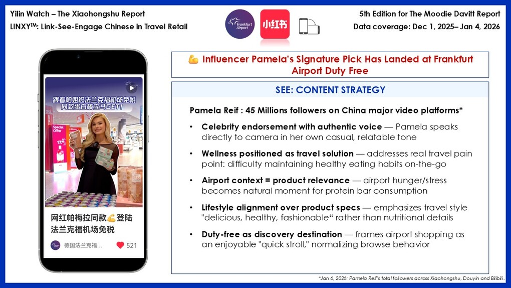 Several posts stood out for their clear practical value, becoming reference content for travellers. One post, in particular, drew strong attention: it featured Pamela Reif, the well-known German fitness coach with 45 million followers across major Chinese video platforms (Xiaohongshu, Douyin and Bilibili as at 1 January 2026), introducing her Protein Bar at a Heinemann Duty Free store. The format tapped into wellness consumption trends and sparked visible enthusiasm in the comments.