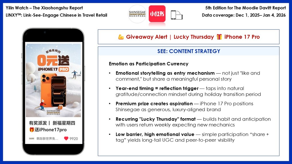 Beyond transparency, engagement is structurally engineered. Lucky Thursday giveaways and red-packet campaigns generate hundreds of comments per post, with users creating long-tail content, tagging travel companions and sending New Year wishes.