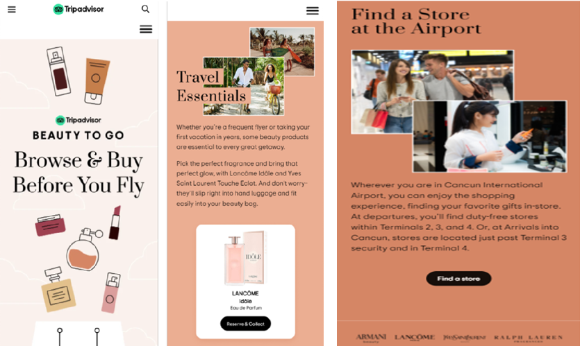 Each visitor browsing on Tripadvisor to prepare an upcoming trip is targeted by media ads which promote L’Oréal brands in duty free by redirecting them to an exclusive Beauty to Go landing page. Visitors can then access a selection of L’Oréal Travel Retail best-sellers and the Reserve & Collect option on Dufry’s site, or buy at the airport.