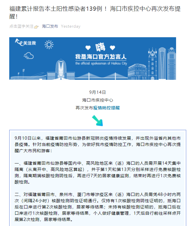 The Hainan authorities are treating the new outbreak seriously. The Haikou Center for Disease Control and Prevention has implemented a series of strict measures to prevent any outbreak on the island. It said in a statement yesterday: “People who come to (return) to Haikou from domestic medium and high-risk areas such as Xianyou County, Putian City, Fujian Province shall be quarantined for 14 days (counting from leaving the medium and high-risk areas), and on the 1st and 13th days Samples are taken for free nucleic acid testing.”
