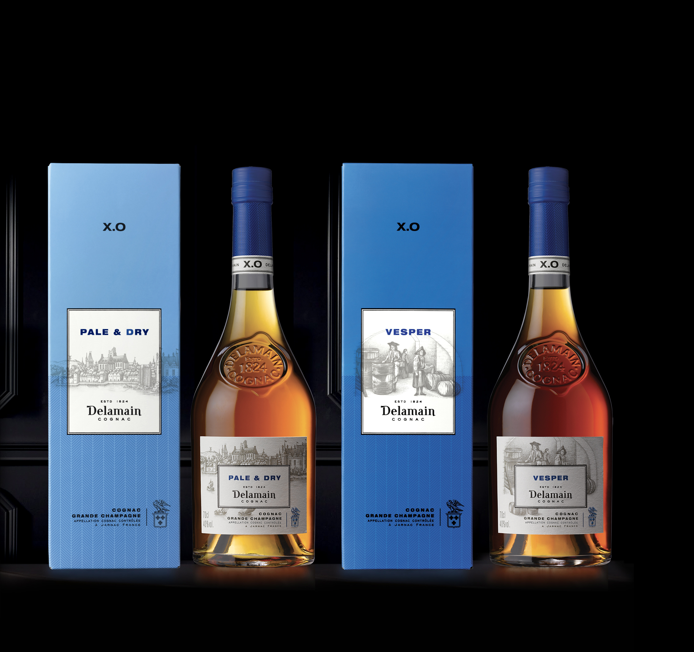 Delamain has introduced new packaging for its travel retail bestsellers: Pale & Dry XO and Vesper XO Cognacs.
