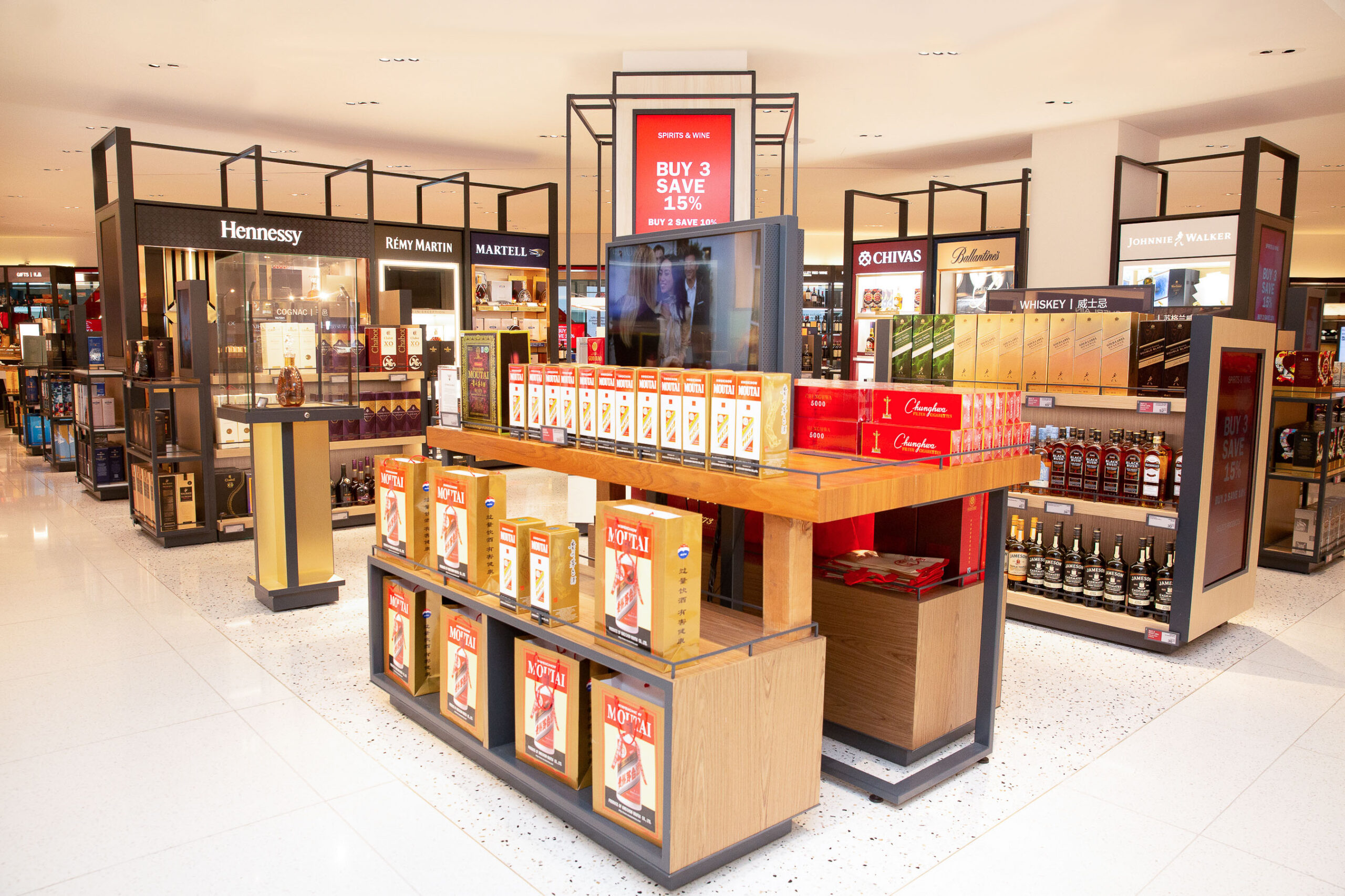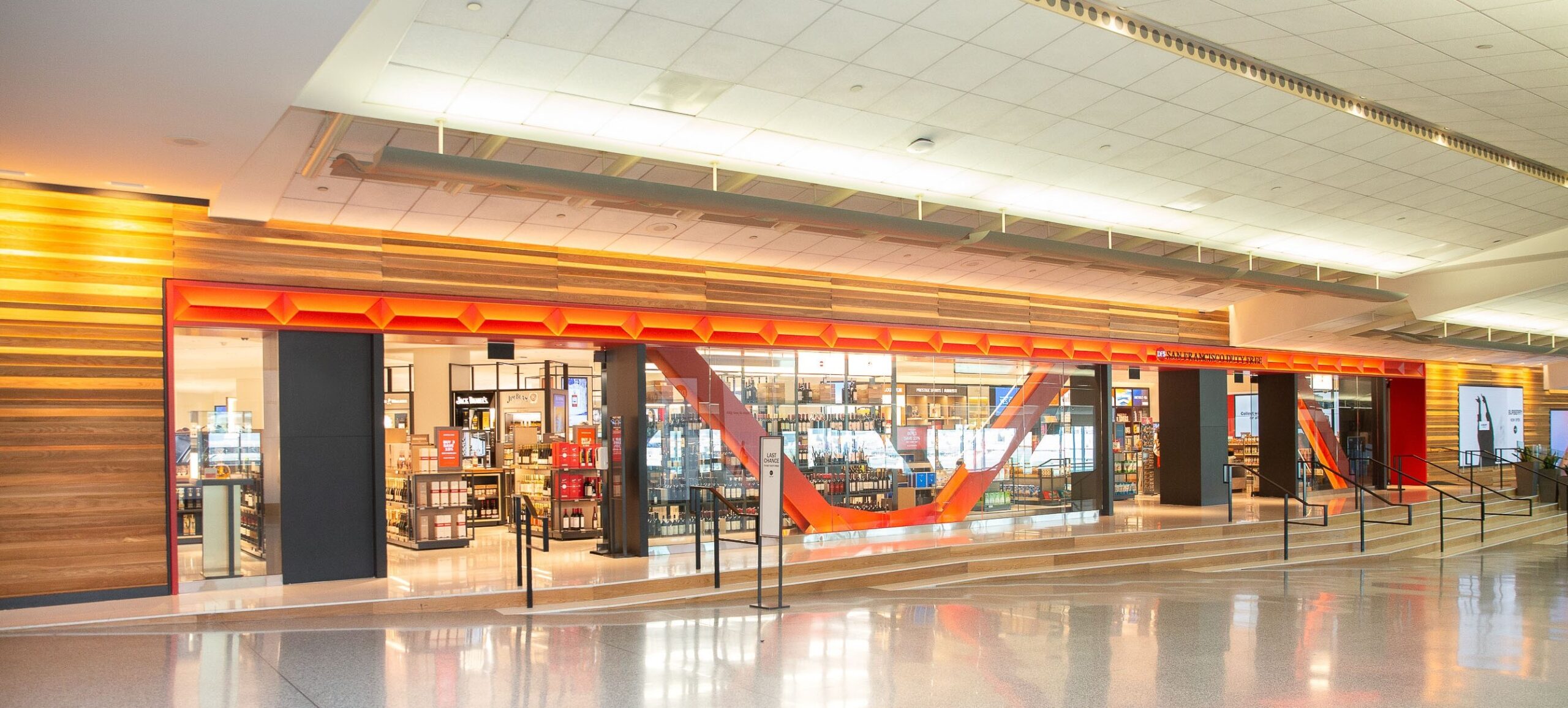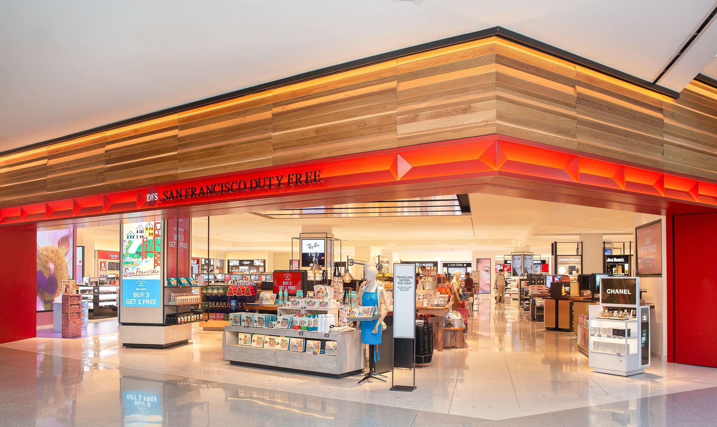 DFS’s renovated stores in the A and G concourses are located just past the newly expanded security checkpoints. The store designs reflect the “laid-back yet cosmopolitan essence of San Francisco”, DFS said, with a façade that features iron-painted International Orange (the colour of the Golden Gate Bridge) and natural wood.