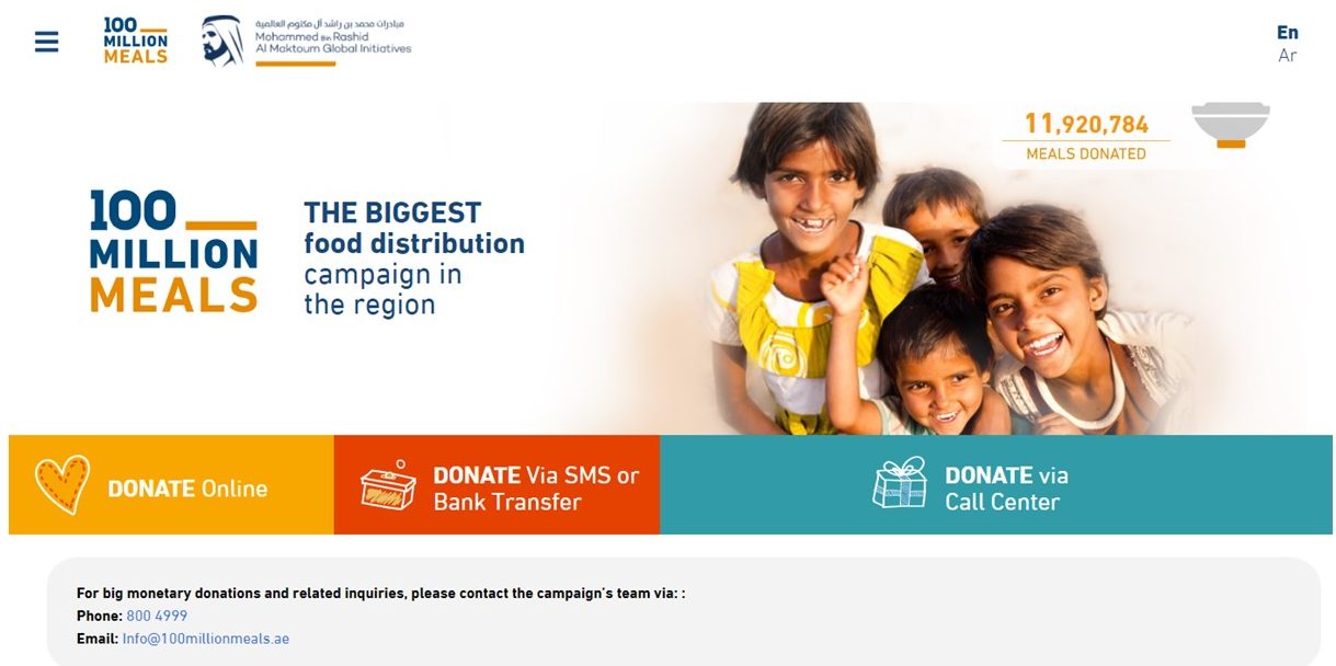 Donation Channels Donations to the ‘100 Million Meals’ campaign can be made in four ways. First, on the campaign’s website www.100millionmeals.ae; second, by contacting the campaign call centre on the toll-free number 8004999; third, via the designated bank account through Dubai Islamic Bank (AE08 0240 0015 2097 7815 201); and fourth, by sending “Meal” by SMS on Du and Etisalat UAE numbers listed on the website. |