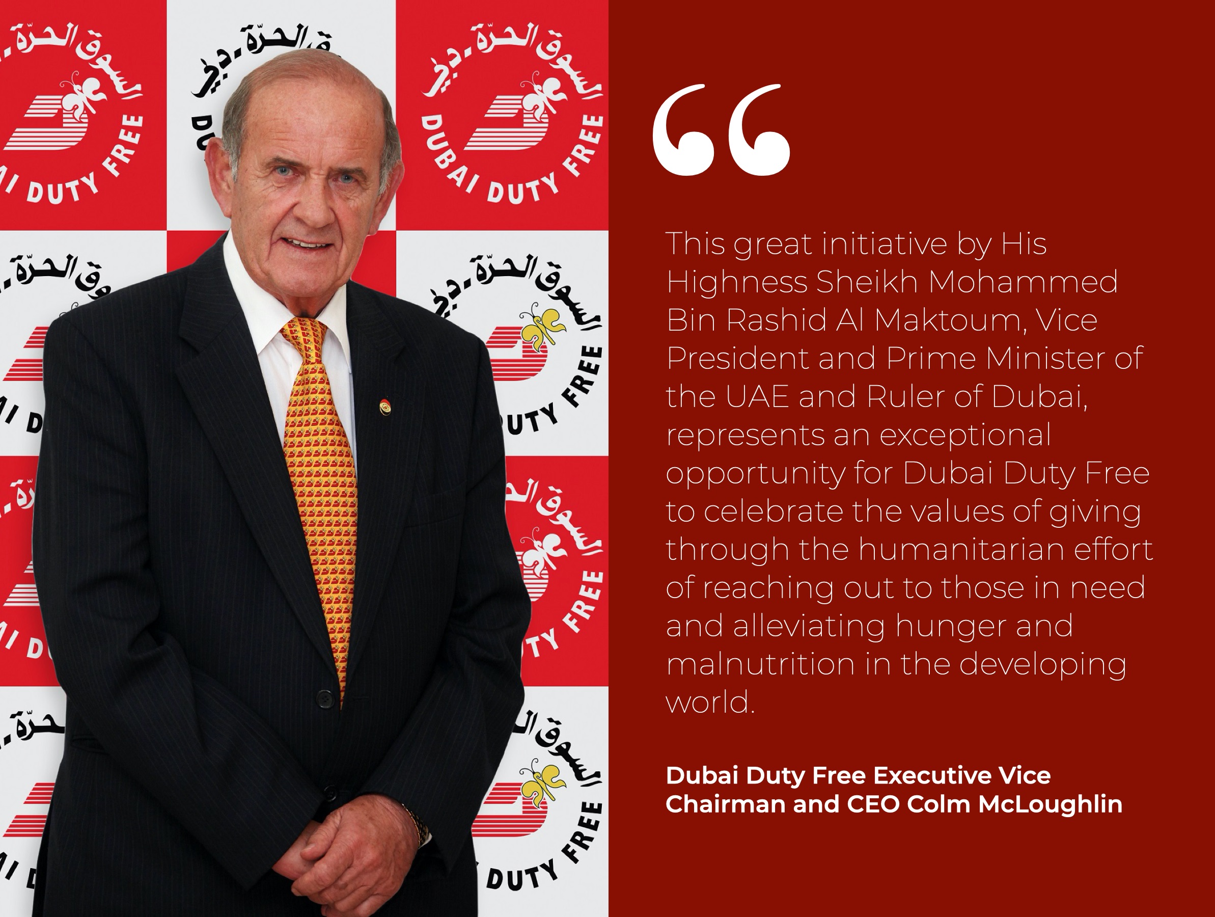 “This great initiative by His Highness Sheikh Mohammed Bin Rashid Al Maktoum, Vice President and Prime Minister of the UAE and Ruler of Dubai, represents an exceptional opportunity for Dubai Duty Free to celebrate the values of giving through the humanitarian effort of reaching out to those in need and alleviating hunger and malnutrition in the developing world.”