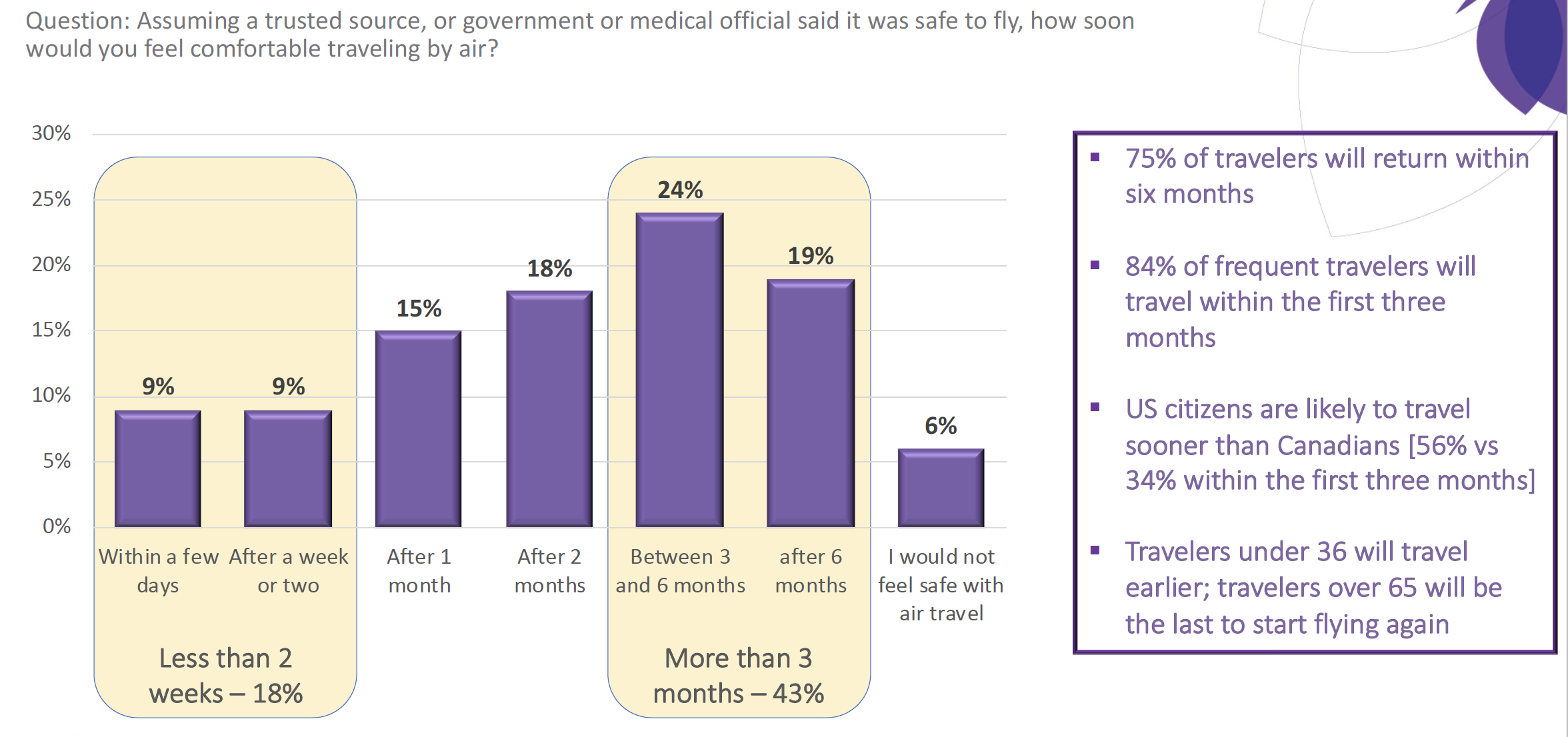 The survey of 509 respondents from the US and Canada found that 75% of passengers will return within six months of being told it is safe to fly and 84% of frequent travellers will travel within the first three months.