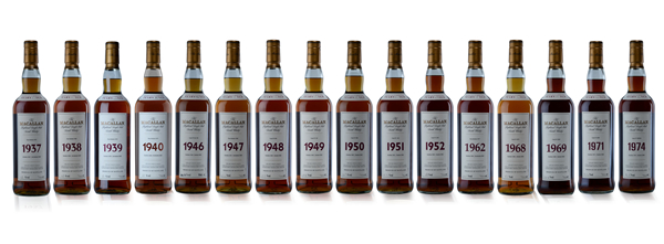 The record-breaking sale of 19 bottles of The Macallan’s Fine and Rare Collection featured vintages ranging from 1938 to 1974 |