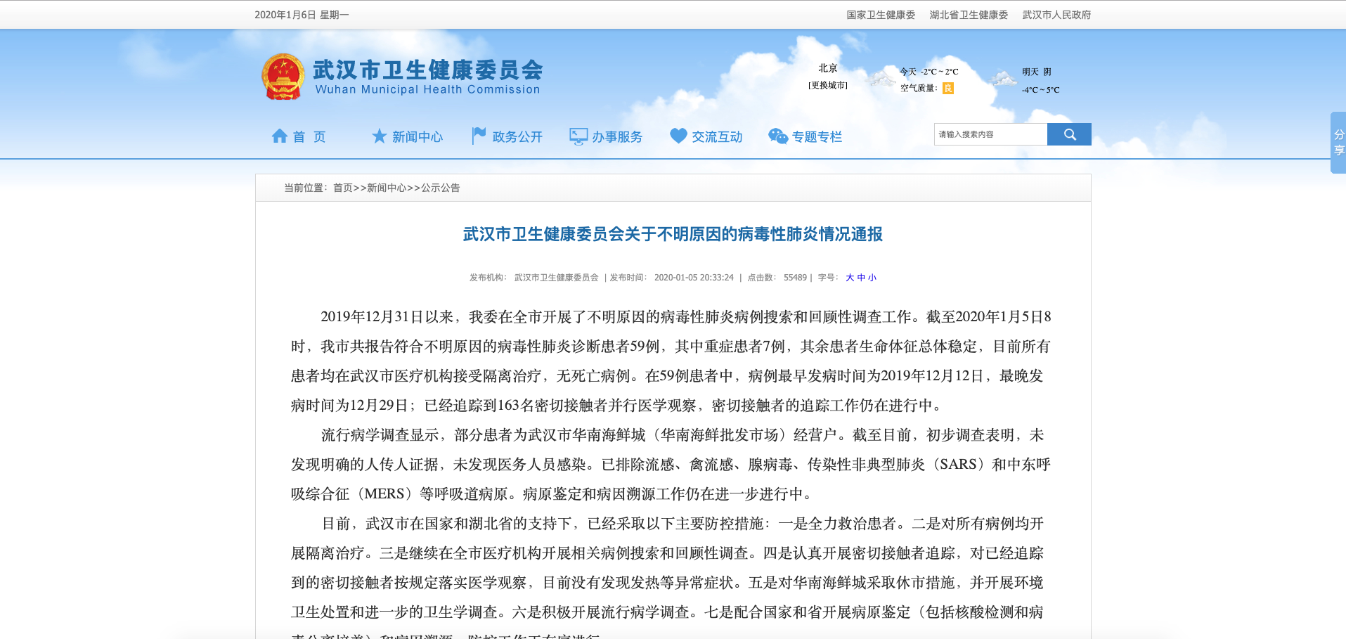 The Wuhan Municipal Health Commission has over recent days carried out an investigation into a viral pneumonia of unknown cause. As of yesterday (5 January), a total of 59 cases of viral pneumonia with an unexplained diagnosis have been reported in the city. The investigation has established that some patients with the pneumonia were dealers or vendors in the Huanan Seafood Market.