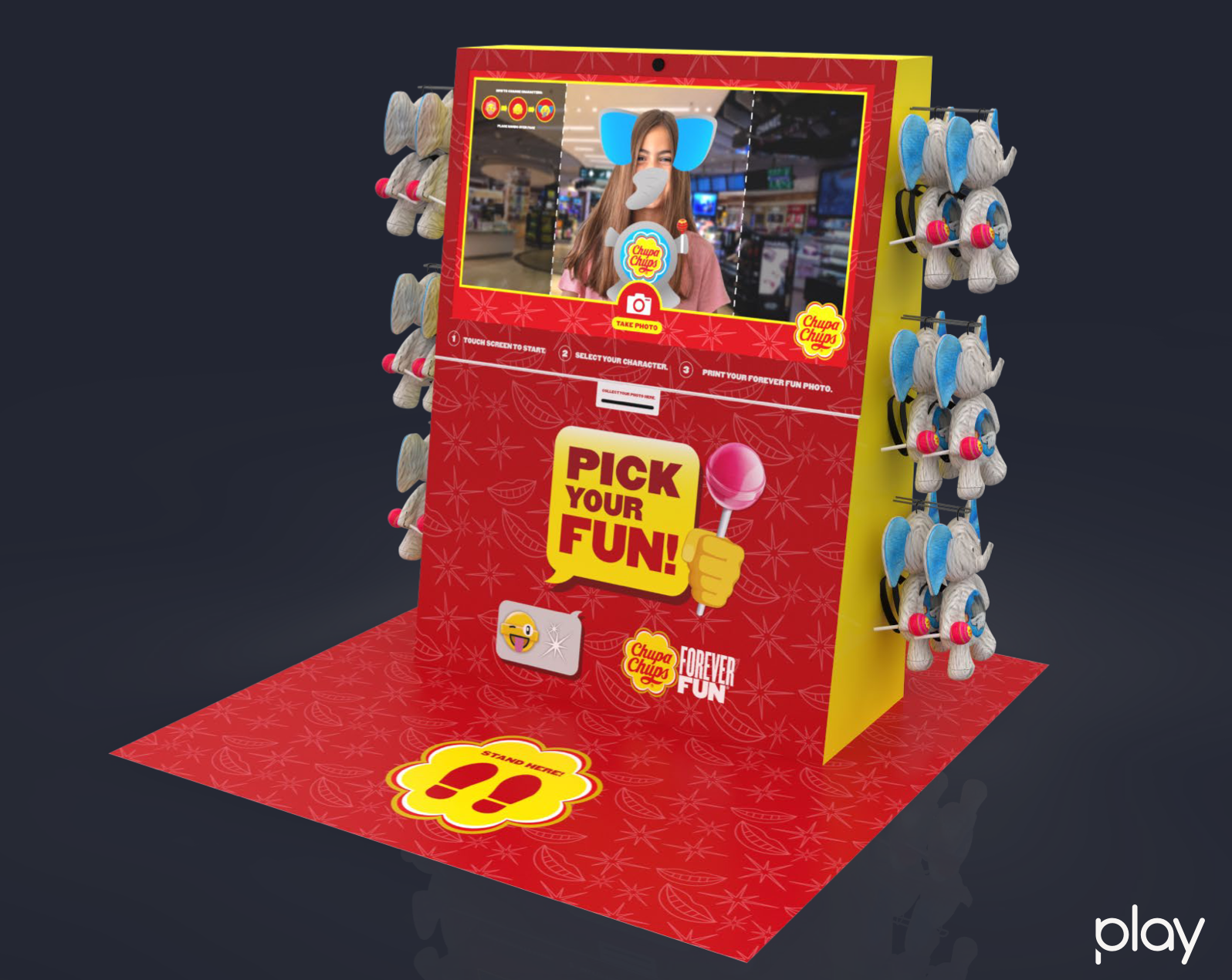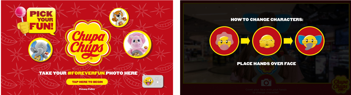 The activation includes a photo booth and product promotion area to encourage customers to engage with the Chupa Chups brand. They can have their photo taken as one of the Chupa Chups backpack animal family, take away a polaroid memento and enter their contact details to receive the digital photo to use its across social media platforms.