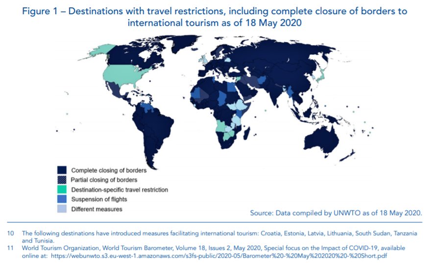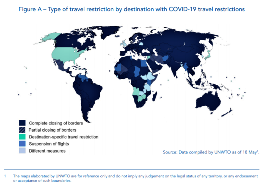 The report notes that 100% of all destinations worldwide continue to have some form of COVID-19-related travel restrictions in place. Furthermore, as of 18 May 75% continued to have their borders completely closed for international tourism. In 37% of cases, travel restrictions have been in place for ten weeks, while 24% of global destinations have had restrictions in place for 14 weeks or more.